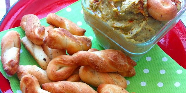 4. يقطع العجين إلى 4 أجزاء ويقطع كل جزء إلى 6 قطع وتلف 1 قطعة على شكل سجق طوله 10 سم ويقطع شكل السجق نصفين بالطول وتلف الشرائط معاً مع الضغط على الطرفين لتغلق وتوضع على الصينية المعدة ونكرر مع باقي العجين ثم يدهن بالزيت وينثر عليه الملح وتُخبز في الفرن لمدة 15 إلى 20 دقيقة حتى يصبح هش وذهبي .