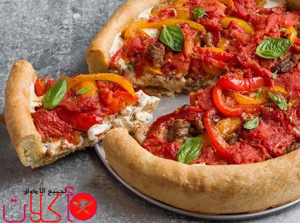 بيتزا شيكاغو الأمريكية على شكل الفطيرة مع الحشوة المضاعفة للطماطم والجبنة لتصبح سميكة وكافية لتغطية شرائح السجق في داخلها كي تبقى طريقة، ولا تجف بتأثير الحرارة، ويتم تحضيرها بعجينة سميكة تشبه عجينة الخبز مع دقيق الذرة .