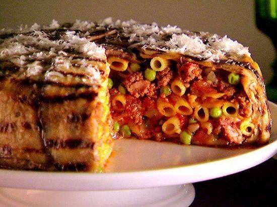- تفرد شرائح الباذنجان على قالب الكيك حتى تمام التغطية و تسكب الحشوة المكونة من المكرونة و البسلة و اللحم.