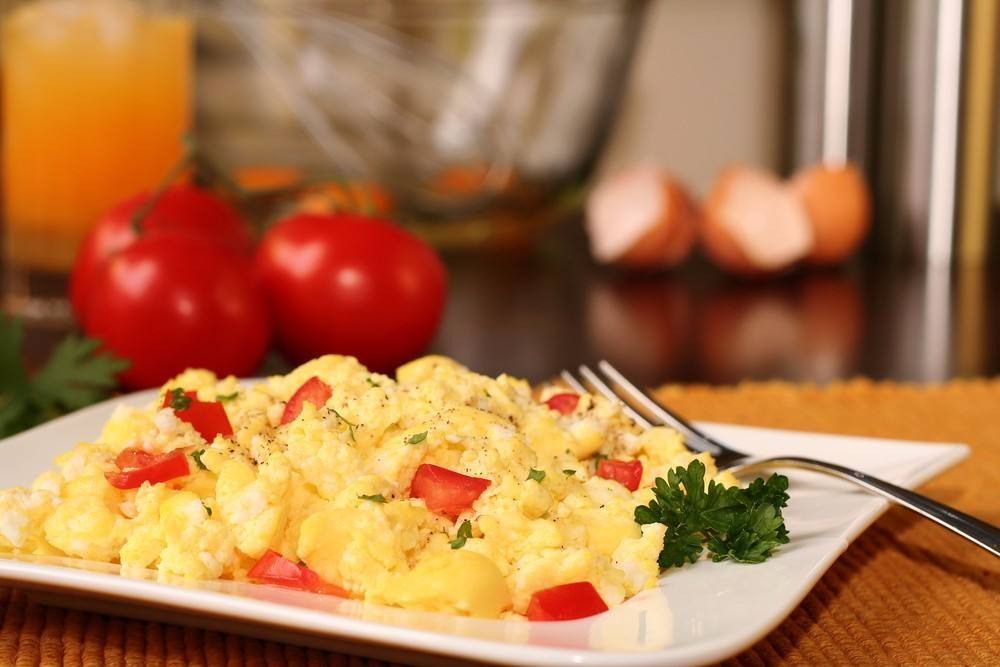 - يوضع البيض في المقلاة، ويقلب بسرعة حتى يبدأ في النضج.