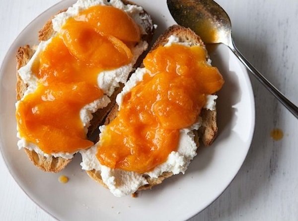 - بعد تحميص شرائح التوست، ادهني كل منها بجبنة الريكوتا وضعي بضع ملاعق مملوءة من مربى المشمش، وقدميها.
