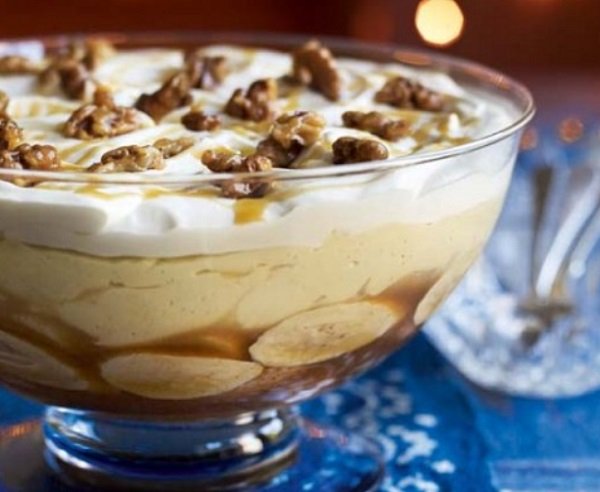 ترايفل الموز بالكراميل ، ترافل مغذي ورائع مكون من طبقة من البسكويت السادة مع الموز، الكريمة والعسل، وصوص الكراميل المالح، وكاسترد الحليب ونشاء الذرة، مع طبقة رقيقة على الوجه من توفي الجوز.