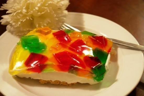 - ثم نقوم بعمل جيلي أصفر و نصبه فوق الخليط و مكعبات الجيلي، ثم نضع الصينية فى الثلاجة .