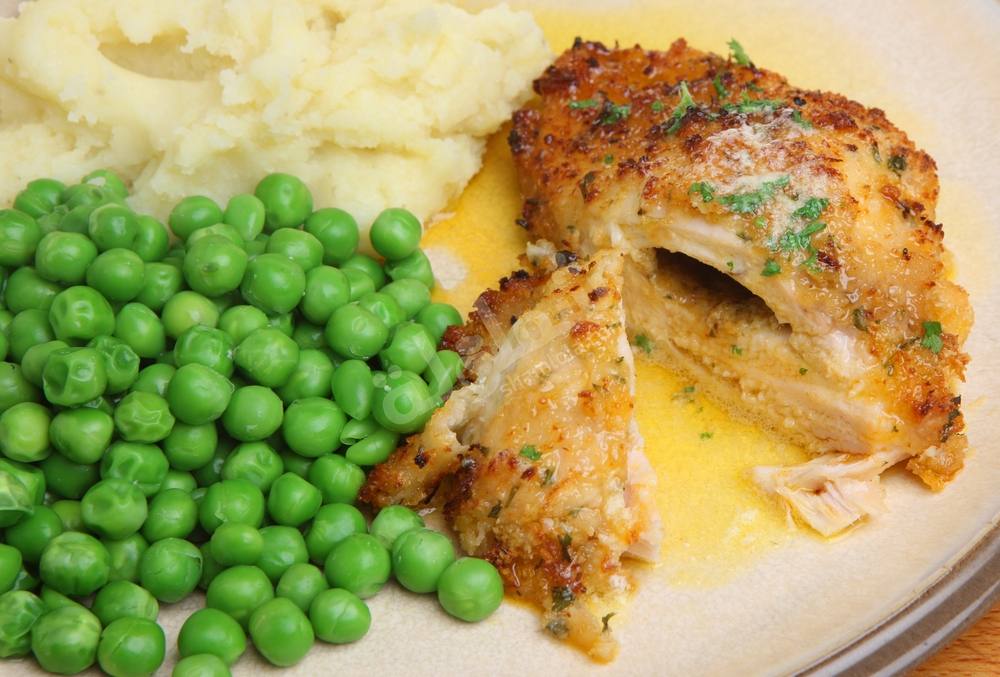 قدمي التشيكن كييف ساخن مع الخضروات المفضلة والبطاطس المحمرة .