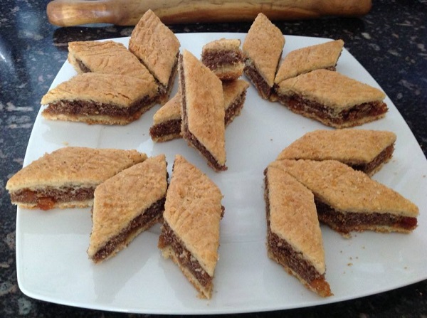 حجازية اسكندراني وصفة مصرية بامتياز شهية ومغذية عبارة عن طبقتين سميد وطحين محشية بخليط من السميد وجوز الهند والزبيب ومكسرات سواء لوز أو بندق أو جوز .
