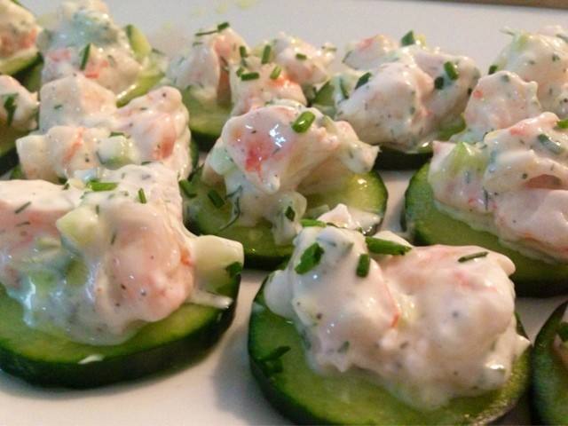 - ضعي مقدار ملعقة صغيرة الحجم من مزيج الجمبري فوق حلقات الخيار.
