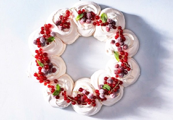 - عند التقديم نخفق الزبادي والكريمة المكثفة مع 1 ملعقة كبيرة سكر ونوزعها على دوائر البافلوفا ونزين بالتوت والرمان والزبيب والنعنع .