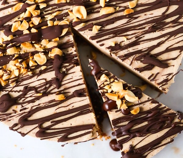 - نسكب الحشوة فوق العجينة ونضع القالب في الثلاجة لمدة 3 ساعات على الأقل حتى يصبح صلباً . نخرج القالب من الثلاجة ونتركه لمدة 10 دقائق، وقبل التقديم نزين القالب بالشوكولاته الداكنة المذابة والفول السوداني المحمّص .
