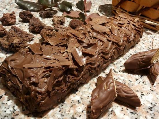 - ثم نذوب شيكولاتة على حمام ماء ساخن ونغطس الاسطوانات بداخل الشيكولاتة وبشوكة نخرم الاسطوانات من الشيكولاتة ونضعها على ورق الزبدة وعندما تتماسم بواسطة شوكة نعمل عليها خطوط حتى يصبح لدينا شكل الحطب .