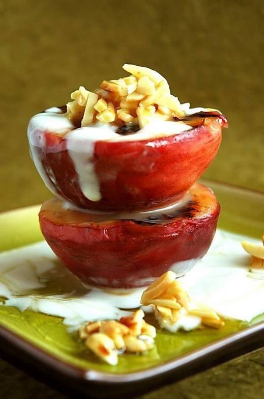 - عندما يجف سطح الخوخ يرش بقليل من العسل ويرش السطح باللوز يقدم الخوخ .