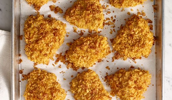 دجاج كرسبي بالفرن ، إن خبز الدجاج بالفرن طريقة أكثر صحية وأقل دسماً من طرائق الطهي الأخرى خاصة القلي، وصفة شهية من قطع صدر الدجاج المغطاة بمزيج اللبن مع الكورن فليكس، ويقدم مع طبق من السلطة.