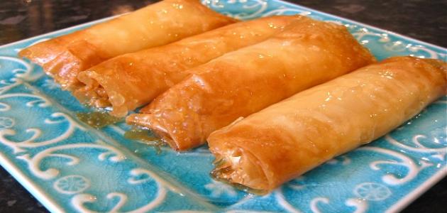 - نضع مقداراً من الحشوة التي حضّرناها على طرف العجين ونطوي الأطراف ثمّ نلفّ العجينة لتصبح بشكل اسطوانيّ.