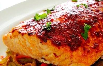- يُشطف السالمون ويُتبل بالملح والفلفل، ثم تُوزع 2 ملعقة كبيرة من صلصة الفلفل المشوي على سطح لحم السالمون وليس الجلد.