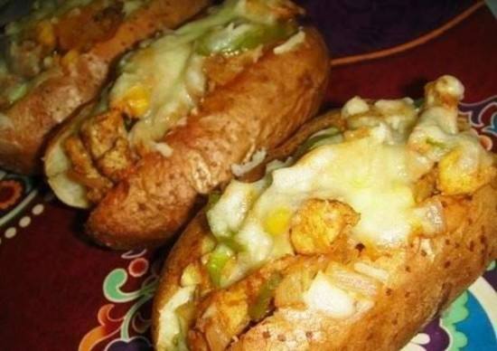 - عندما تسوي البطاطس نفتحها من المنتصف ونحشيها بالخلطه ونضع فوقها الجبنه وندخلها الفرن حتى تذوب الجبنه.