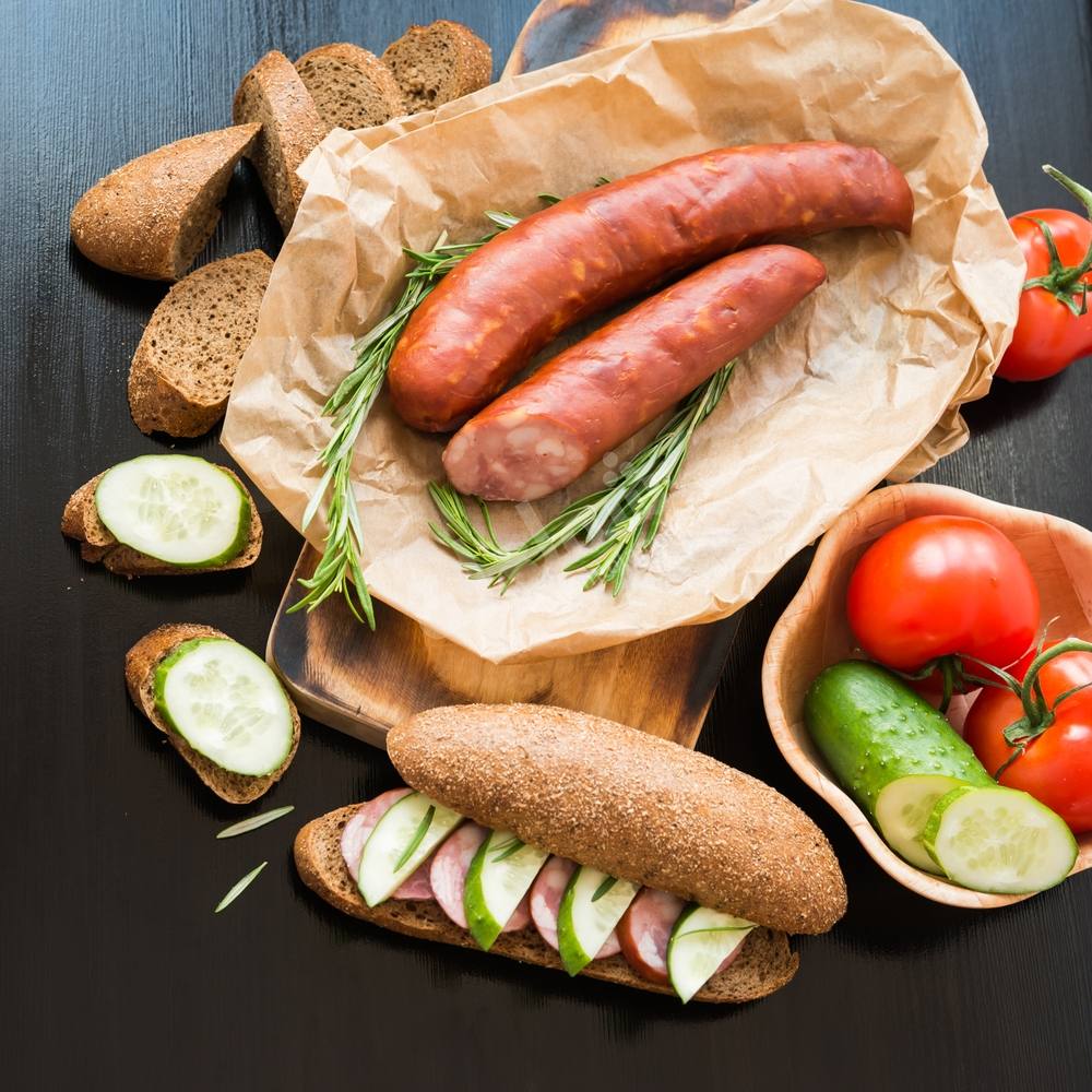 - ضعي شرائح السوسيس و الخيار و الطماطم فوق خبز الفينو.