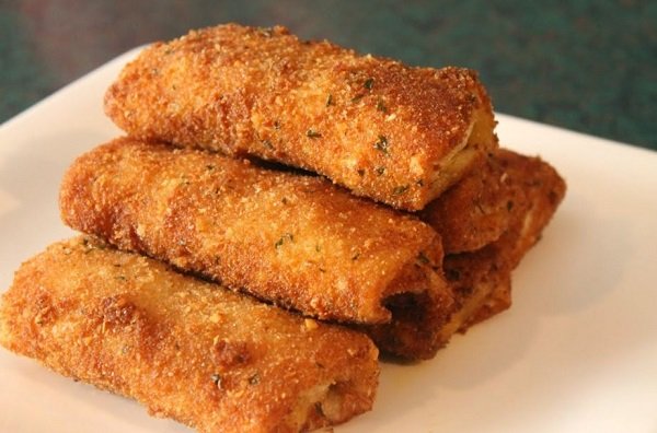 - بعد أن نلفها نغطي القطع بالبيض والبقسماط ونقليها بالزيت حتى تصبح ذهبية ثم نصفيها ونضعها في طبق التقديم .