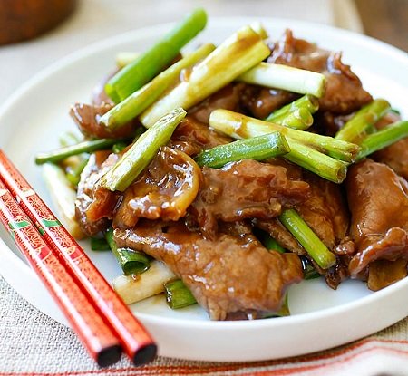 - سخني الزيت المتبقي وحمصي الثوم والبصل حتى تفوح رائحتهما، أعيدي لحم البقر الى المقلاة وحركيهم لعدة مرات قبل إضافة الصوص، تابعي تحميص اللحم حتى تنضج الشرائح تماماً، ثم ضعي البصل الأخضر، مع التحريك السريع لعدة مرات، رشي الملح والسكر للتنكيه، اسكبيهم في طبق وقدميه ساخناً مع الأرز.
