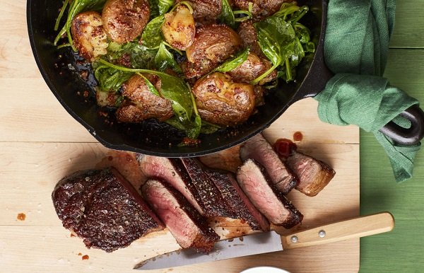 ستيك اللحم مع البطاطس ، طبق عائلي لذيذ من ستيك اللحم المحمص بالزيت مع البطاطا المهروسة قليلاً والسبانخ والخردل، وجبة غنية ومغذية ومليئة بالمكونات الصحية، جربيها.