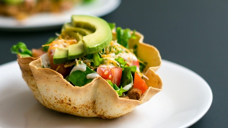 سلطة الافوكادو مع خبز التورتيلا وهي من اشهى انواع السلطات خاصة طريقة تقديمها فهي عبارة عن خبز تورتيلا مشكل على شكل وعاء وبداخله مزيج من الخضراوات وتعلوه حبات الافوكادو المايونيز اللذيذ واليكم طريقة تقديمها