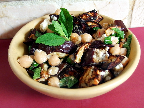 سلطة الباذنجان والحمص تحضر بجانب اكلات رمضان واليومية ، تحضر من الباذنجان المشوي، مع مفروم البندورة والكزبرة وحبوب الحمص بالإضافة تتبيلة الصلصة الخاصة والتي أعطتتها مذاقاً لايقاوم ، فهي من اطيب مقبلات الباذنجان .