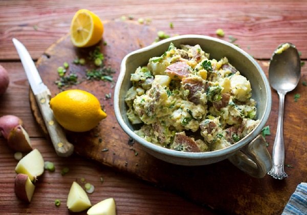 سلطة البطاطس المسلوقه بالمايونيز ، تتميز سلطة البطاطا المهروسة هذه عن غيرها بالصلصة الكريمية الشهية من المايونيز والخردل والصلصة الحارة إضافة إلى البصل الأخضر والأعشاب المفيدة .