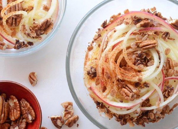 سسلطة التفاح بالزبادي للرجيم ، يتميز هذا الطبق بشكله الرائع إلى جانب مذاقه الشهي كما أنه صحي ولا يحتوي على الكثير من السعرات الحرارية وهو مثالي للريجيم ويتكون من الزبادي اليوناني والتفاح والجوز والقرفة .