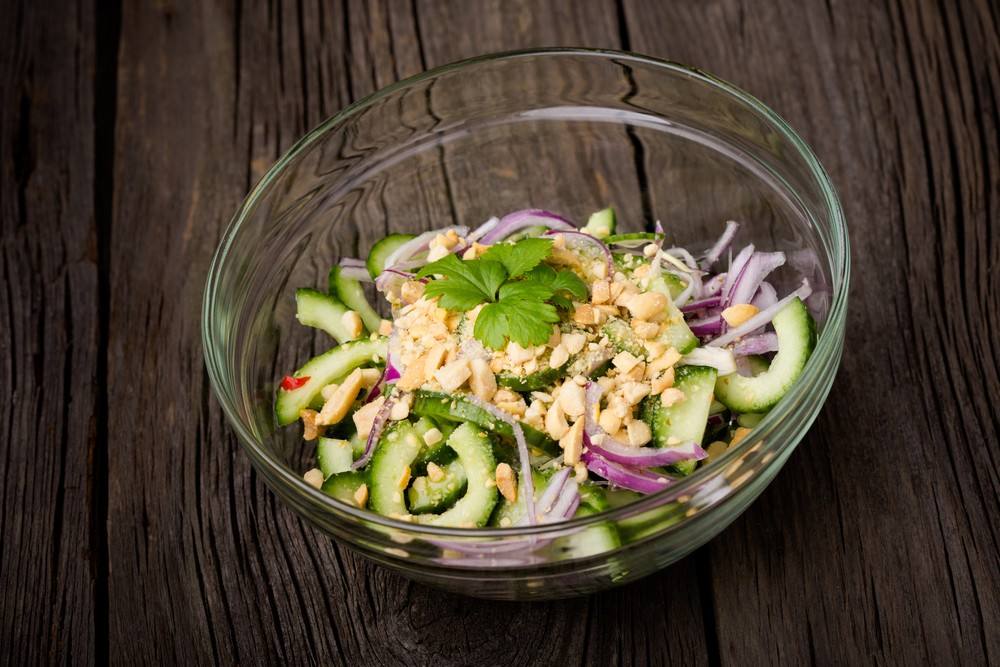 - ضعي مزيج الخل فوق البصل و الخيار و قلبي.