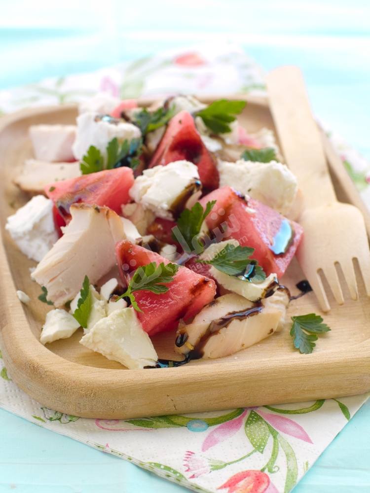 - يرص على طبق التقديم الخضروات الورقية والدجاج والبطيخ الوردي و يضفى 1/2 كوب من مخلل البطيخ والبصل والنعناع وينثر عليها التتبيلة و تقدم .