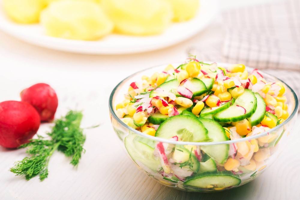 - يوضع الذرة في بولة، ويضاف إليه الخيار والفجل والشبت، ويخلط جيداً.