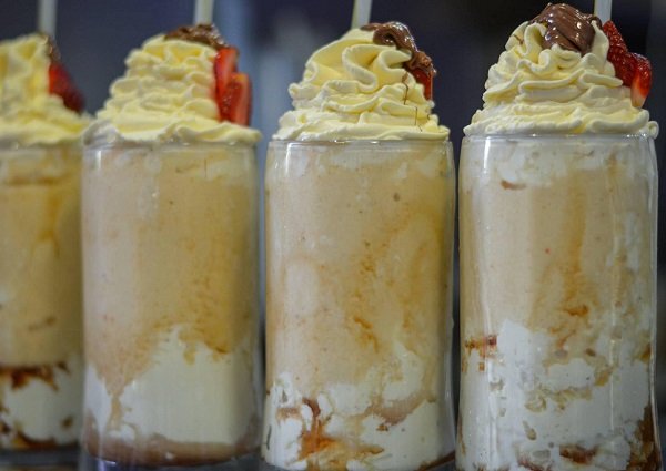 - نوزع الفواكه المقطعة على زبادي التقديم ونسكب عصير الفريز في كلٍّ منها ثم نضع القشطة فوقها ونزين بالجوز والفستق والعسل وبذلك تصبح سلطة الفواكه الشهية مع القشطة جاهزة للتقديم .