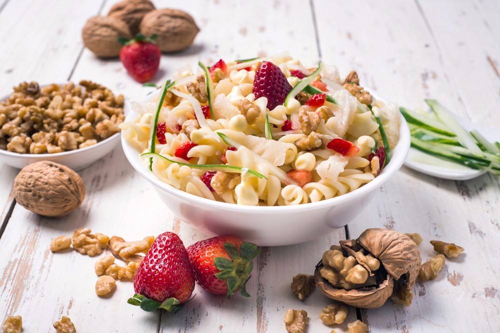 - توضع المكرونة في بولة، ويضاف إليه عين الجمل والفراولة.