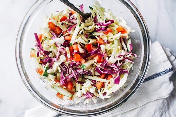 - نضع الملفوف الملون في وعاء ونضيف فوقه كلاً من الطماطم والخيار والبقدونس والنعنع ونخلطها جيداً .