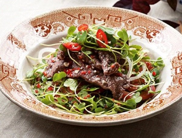 - نضيف لحم البقر إلى وعاء السلطة ونحرك المكونات جميعها ثم ننقلها إلى طبق التقديم ونزين بقطع الفليفلة الحارّة الرائعة .