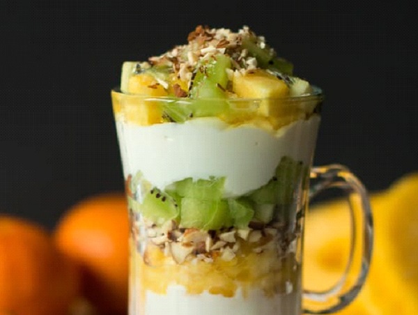 - نضع بقية المكونات في 4 أكواب على شكل طبقات بالترتيب التالي: مزيج اللبن ثم قطع الأناناس ثم اللوز ثم قطع الكيوي وبعدها نعود ونضع طبقة من اللبن الزبادي ثم قطع أناناس ثم قطع كيوي وفي النهاية نضع اللوز .