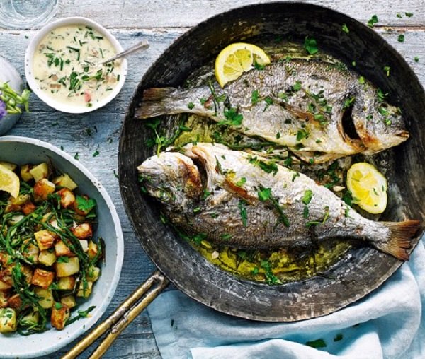 - بعد أن نخرج البطاطا من الفرن نضعها في الزيت الساخن مع نبات إكليل الجبل وهليون البحر و2 فص ثوم مهروس . نحمّي الفرن لأعلى حرارة، ونضيف الزيت لصينية الشوي وندعه يسخن، ثم نضيف الثوم وبقية إكليل الجبل ونحرك لدقيقتين . ثم نضع سمك المرجان مع عصير الليمون، ونضيف 30 غرام الزبدة فوقها ونطهو المكونات لـ 15 دقيقة حتى يكتسب السمك لوناً ذهبياً .