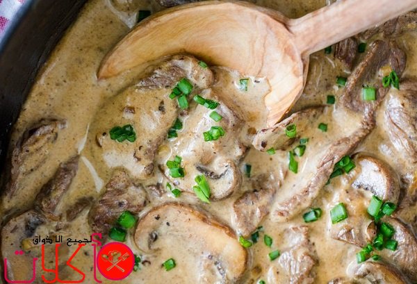 - نسكب شرحات اللحمة مع صوص الفطر في طبق التقديم وبذلك يكون الطبق جاهزاً .