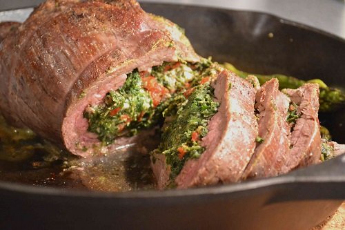 - نلف شريحة اللحم على الحشوة ، ثم نربط قطعة اللحم بخليط مطبخ لاحكام اغلاقها