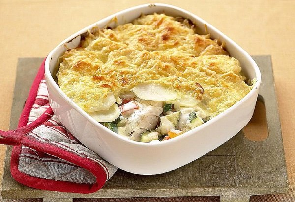 صينية البطاطس بالسمك الفيليه ، شهية وسهلة للغاية كما أنها مغذية وغير مكلفة وهي تتكون من نكهات رائعة يضيفها الكراث والحليب والزبدة والبطاطس المهروسة وجبنة الشيدر .