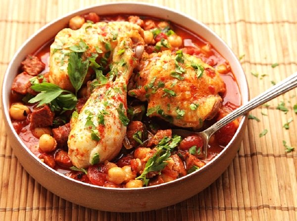صينية الدجاج بالحمص ، طبق سريع التحضير لفخذ الدجاج على الطريقة الإسبانية،و هي تشبه طريقة تحضير الدجاج في المغرب العربي بطريقة السلق والتتبيل بصلصة الطماطم ومرق الدجاج الذي يتم طهيه مع البصل والحمص والباذنجان، ليقدم الطبق بشكل ساخن مع نكهة الخل وزيت الزيتون والبقدونس على وجهه .
