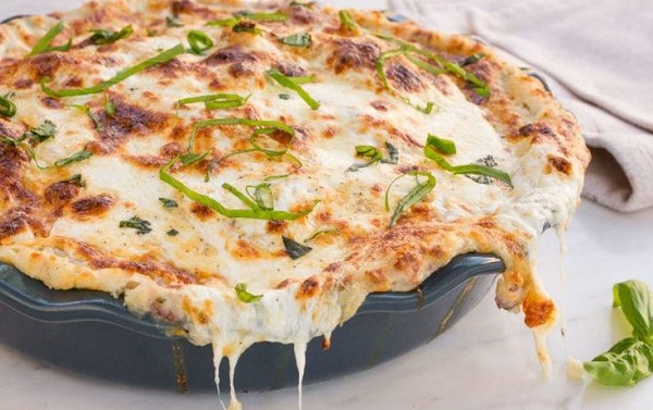 - نفرد الخليط جيداً ونرش جبنة الموزاريلا على الوجه وندخلها الفرن لتتحمر وتنشف .