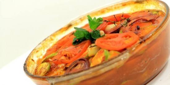 - نحضر صينية ونقوم بعمل طبقات من شرائح البطاطس والكوسة والبصل والطماطم ونضع في المنتصف نصف كمية خليط التوابل ،ثم نسكب نصف الكمية الآخرى على الوجه