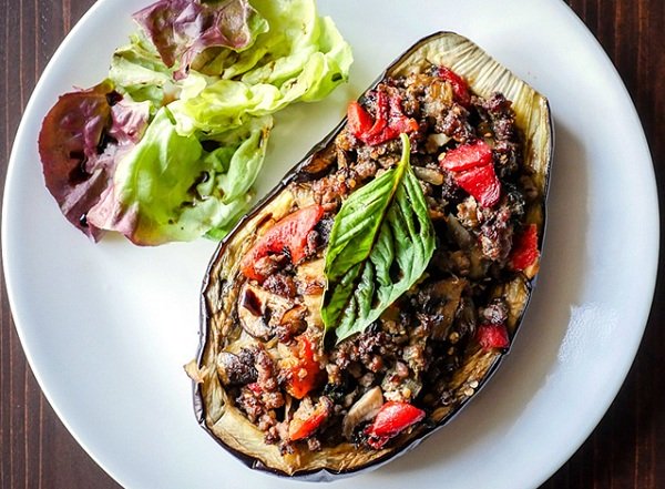 الباذنجان في الفرن على الطريقة الفرنسية بحشوة الدجاج والخضار المكونة من الفطر والفليفلة الحمرا والبصل والريحان، ونكهة خل التفاح، ويعتبر الباذنجان في الفرن طبق مغذي وخفيف على المعدة إلى جانب السلطة التي تفضلينها .