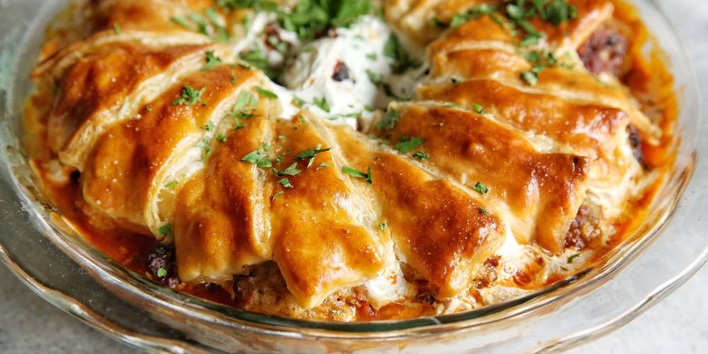 - تقطع عجينة البيف باستري على هيئة مستطيلات يوضع طبقة منها اسفل صينية بايركس مدهونة بزيت .