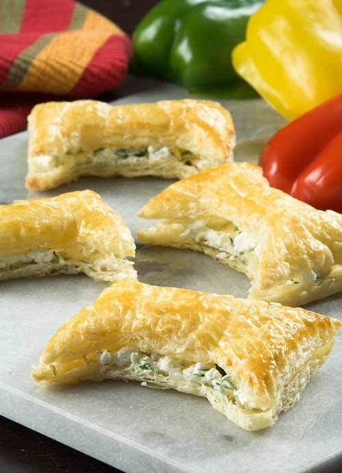 - باستعمال السكين اقطعي كل فطيرة الى طبقتين، ضعي بعض الجبن على الطبقة السفلى ثم ضعي الطبقة الثانية فوق الحشو.