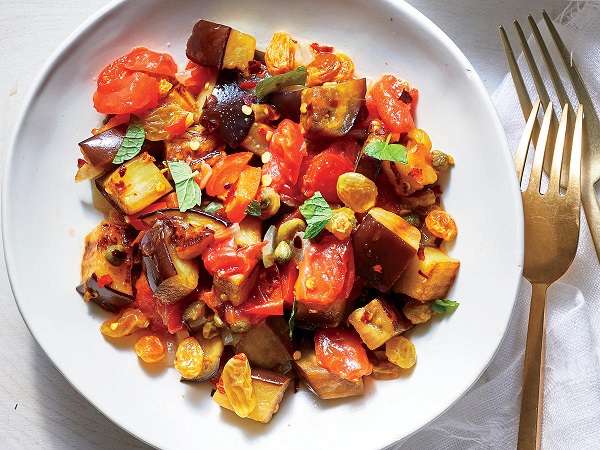 كابوناتا الإيطالية هي وصفة مميزة من المطبخ الإيطالي عبارة عن مزيج من المالح والحامض والحلو حيث تتكون من باذنجان وطماطم وبصل وزيتون وزبيب وعسل شهية للغاية .