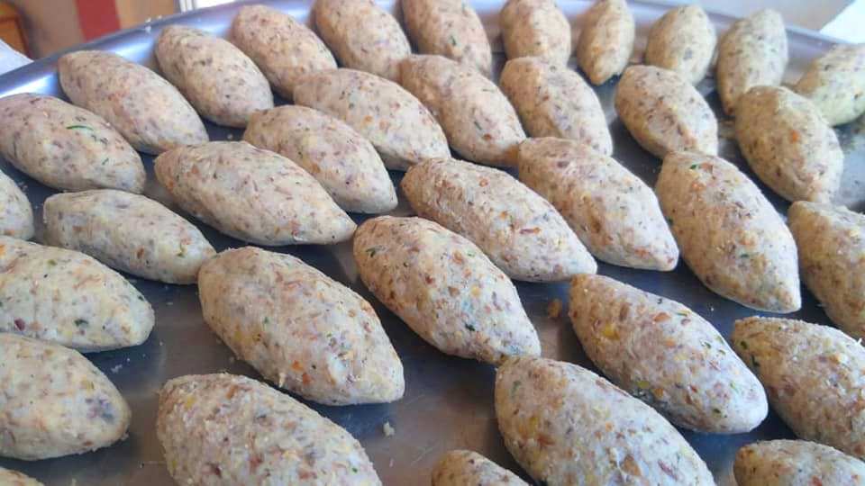 - نضيف الماء بالتدريج مع الاستمرار بالعجن حتى يصبح لدينا عجينة كبة سهلة التشكيل .