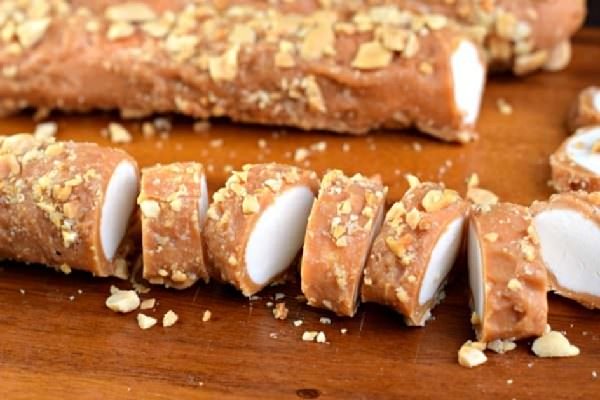 - نحرك الخليط قليلاً ثم نصنع منه رول أسطواني (7-8) انش، ثم نغلفه بورق الزبدة وننقله للثلاجة كي يبرد