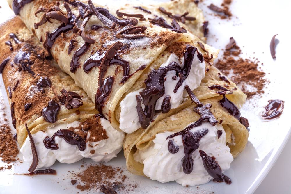9. إسكبى صلصة الشوكولاتة على الكريب ثمّ رشّي عليها السكر الناعم .