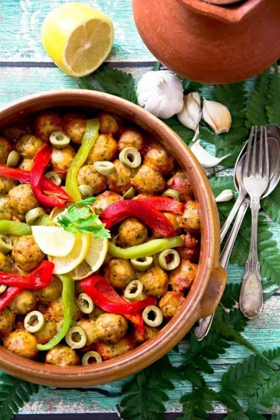 - رصّيها بشكل جميل فوق الصلصة، أضيفي الزيتون وشرائح الفلفل المشوي.