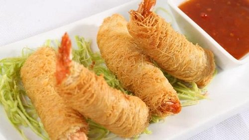 طبق لذيذ تابع للمقبلات ومناسب جدا للبوفيهات والعزائم ، وجبة خفيفة وبنفس الوقت مغذية جدا ويحبها الكبار والصغار. طريقة جديدة ومبتكرة لتقديم الروبيان/ الجمبري. لتحضير هذه الوصفة تحتاجين الى حبات متوسطة الحجم من الروبيان، عجينة كنافة ، زيت نباتي ، بشر ليمون ، لوز مشرح ومحمص